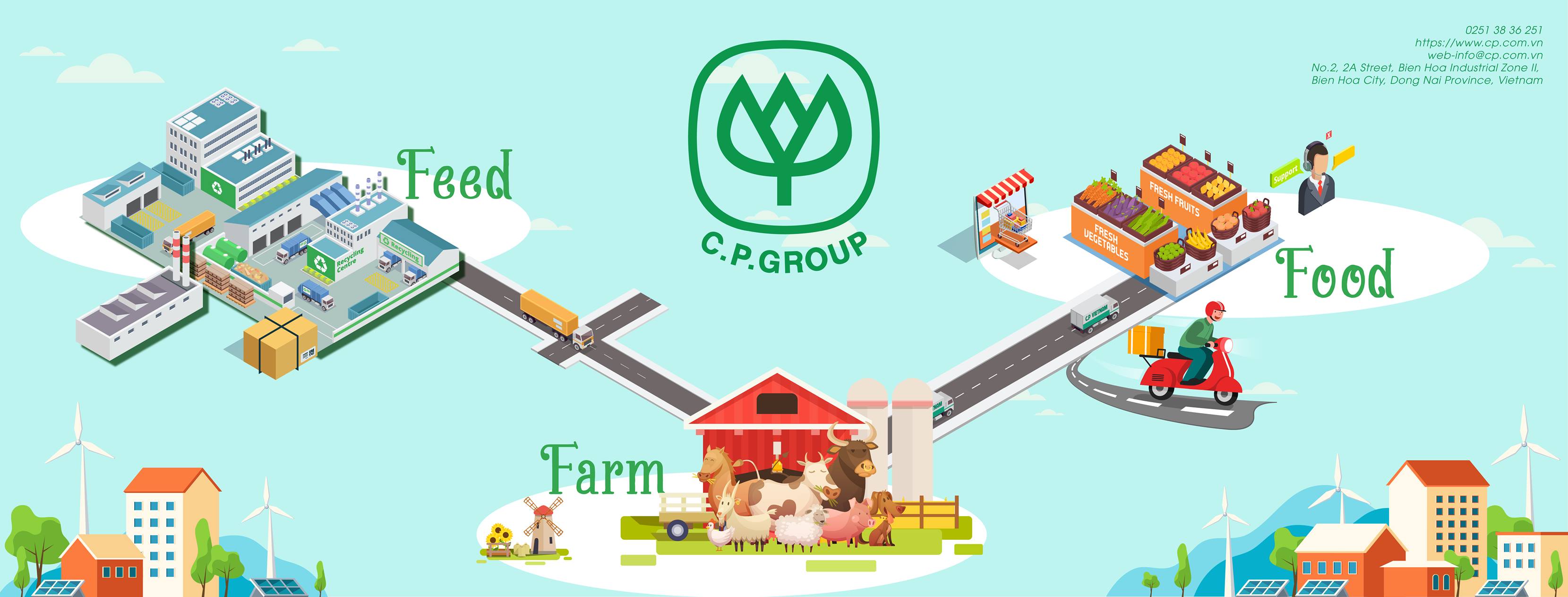 C.P. Việt Nam đã hợp tác với nông dân Việt Nam cả về lĩnh vực chăn nuôi và lĩnh vực nuôi trồng thủy sản, sử dụng mô hình công-nông nghiệp hiện đại kết hợp với việc sản xuất thức ăn an toàn có hệ thống, kiểm soát chuỗi giá trị bắt đầu từ nguồn nhiên liệu đầu vào, con giống, thức ăn chăn nuôi cho đến việc chế biến và phân phối thực phẩm đầu ra. Hàng năm C.P. Việt Nam cung cấp heo thịt cho thị trường với số lượng hơn 6.8 triệu con, trứng gà hơn 750 triệu quả, gà thịt hơn 66 triệu con và xuất khẩu thực phẩm chế biến thủy sản trên 20.000 tấn sang thị trường các nước như, Úc, Nhật Bản, Trung Quốc, Châu Âu.