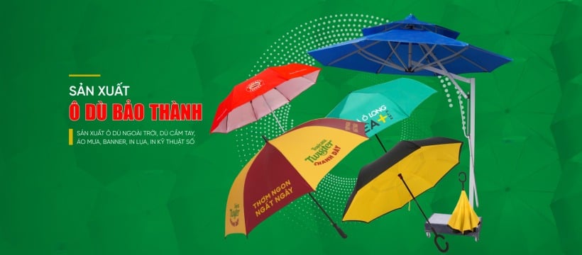 Công ty TNHH SX - TM Bảo Thành còn được nhắc đến bằng cái tên thân thiện “Dù Bảo Thành” với hơn 30 năm kinh nghiệm đã khẳng định được vị trí, thương hiệu trên thị trường trong lĩnh vực sản xuất ô dù ngoài trời, dù cầm tay, áo mưa, banner, in lụa, in kỹ thuật số,…