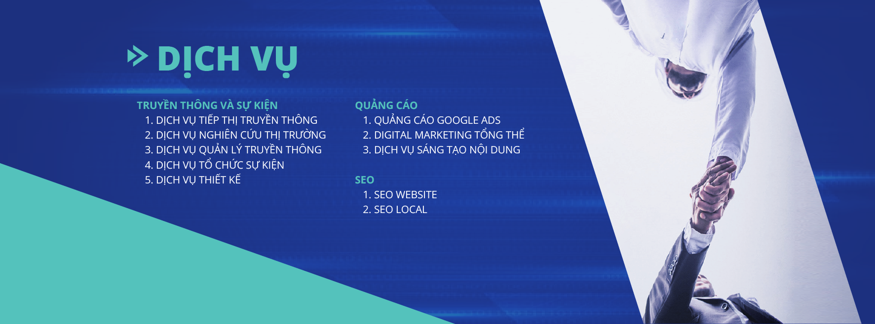 Chúng tôi là một trong những công ty Truyền thông - Quảng cáo - Tiếp thị, Tổ chức Event chuyên nghiệp, sáng tạo hàng đầu. Bằng năng lực cùng sức sáng tạo của mình, chúng tôi giúp quý khách hàng lập kế hoạch và tổ chức những sự kiện chất lượng đỉnh cao. Chúng tôi là người bạn sáng tạo của những thương hiệu khao khát sự khác biệt và tiên phong.