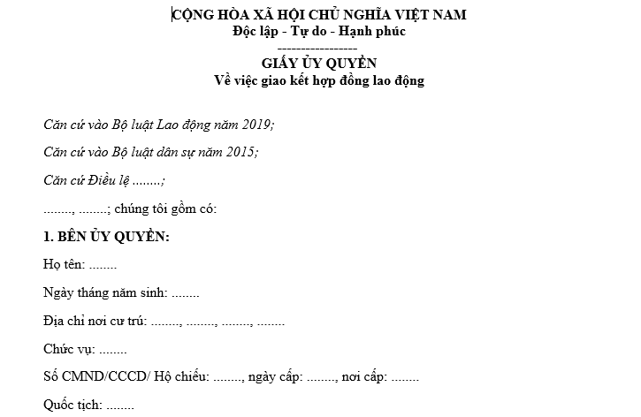 Tham khảo mẫu giấy ủy quyền giao kết hợp đồng lao động mới nhất hiện nay có dạng như sau: