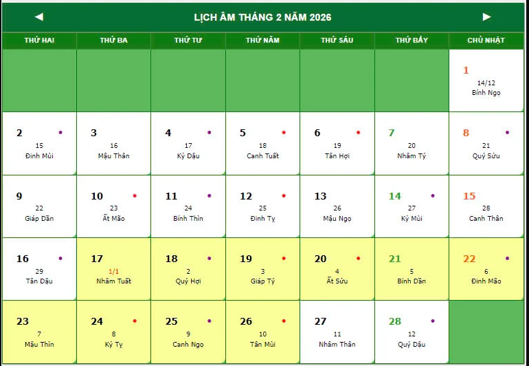 Theo lịch Vạn niên, Tết Nguyên đán 2026 - Tết âm lịch 2026 rơi vào tháng 2 năm 2026 dương lịch. Cụ thể: